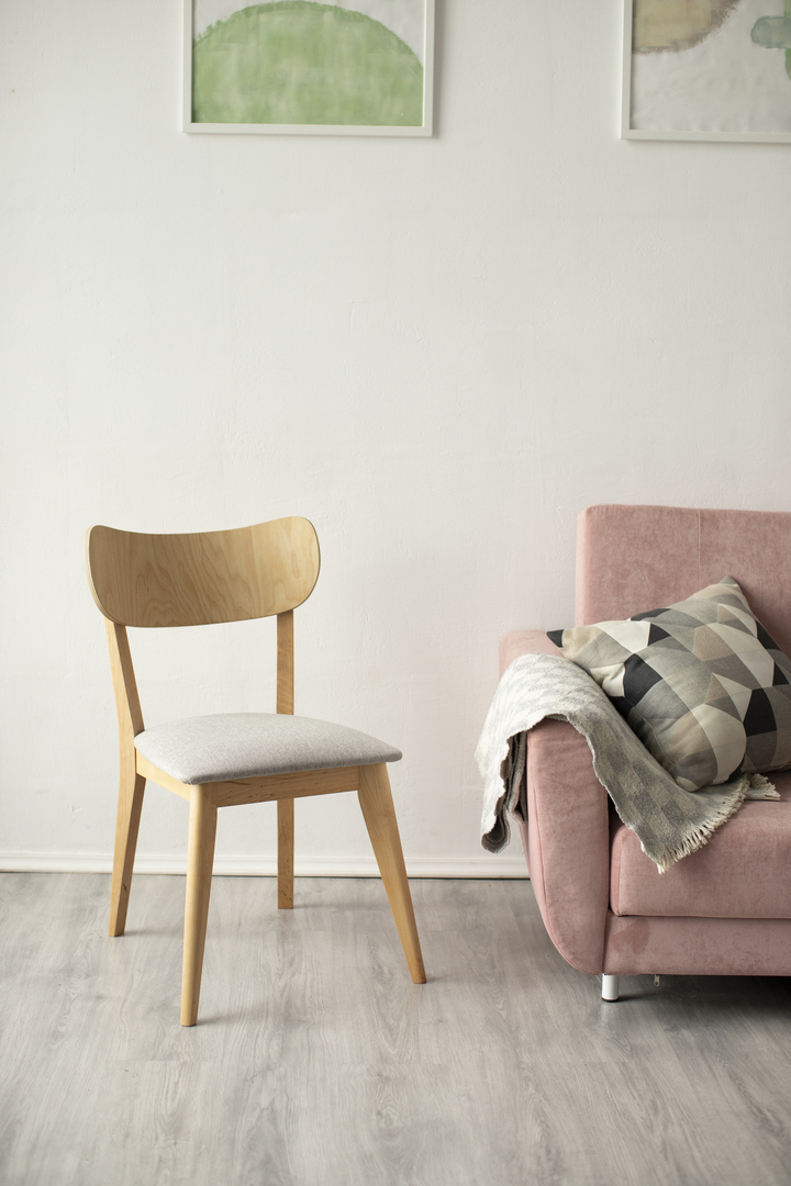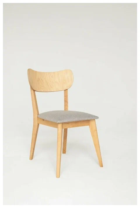 Стул изготовлен из берёзового шпона и цельноклееных берёзовых заготовок. Мягкое сиденье наполнено ППУ толщиной 30мм и плотностью 25 кг/м3. Сиденье обтянуто серой рогожей. Плотность ткани 283 г/м.кв., устойчивость к истиранию по Мартиндейлу 51 000 циклов.