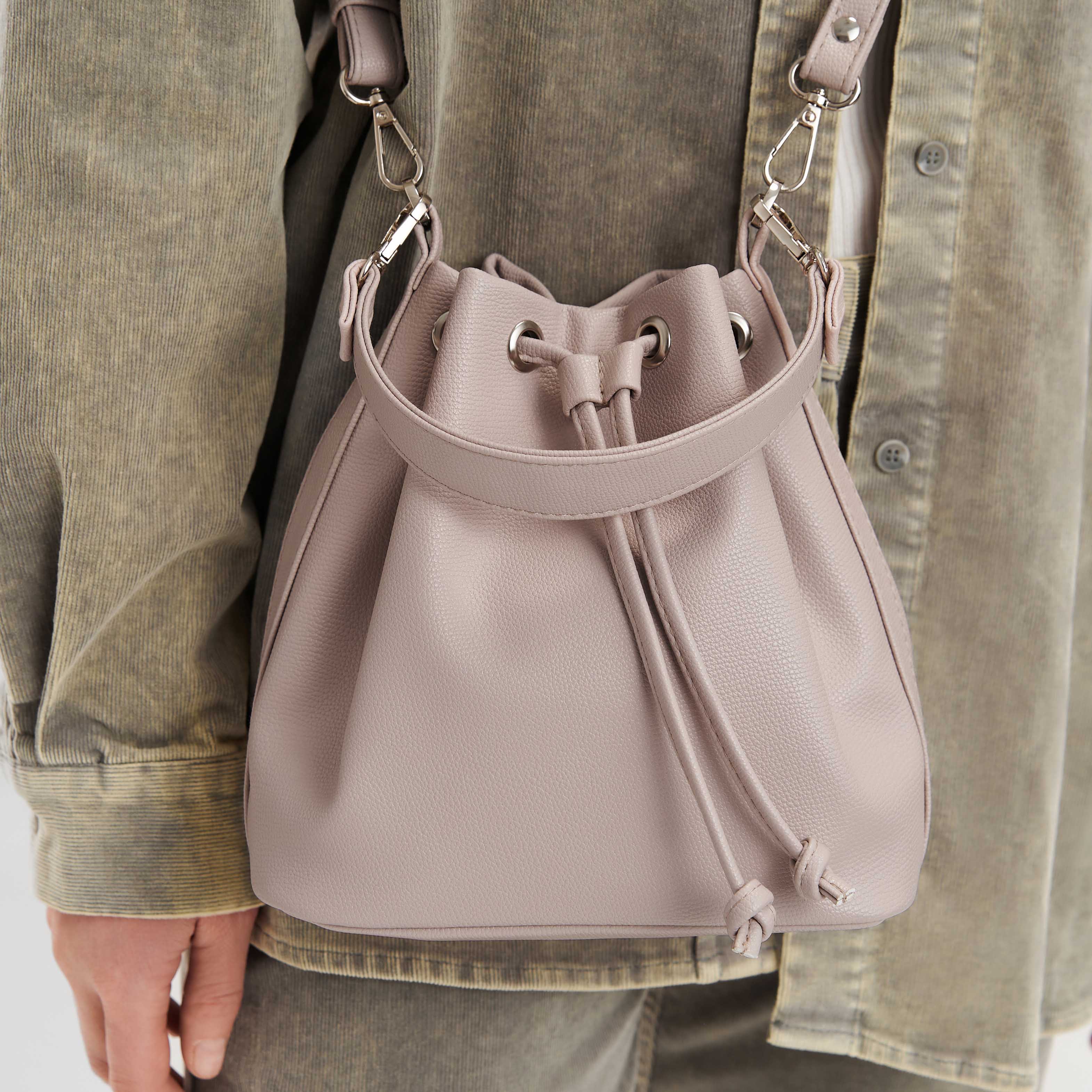 Бакетбэг из мягкой экокожи на затяжках и регулируемым плечевым ремнем.