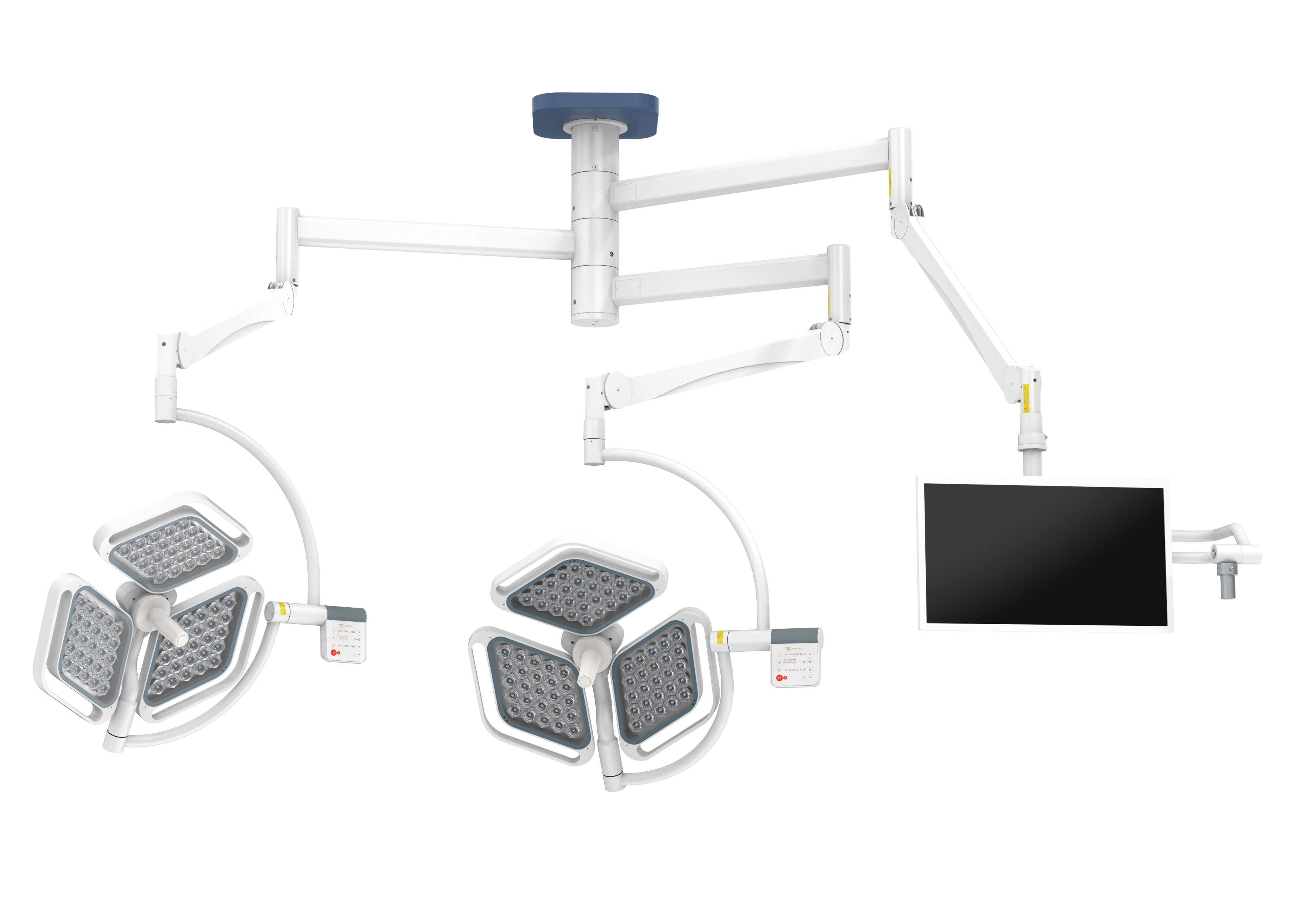 Хирургические светильники CADUCEUS CL3-L3/L3 оснащены тремя поворотными плечами с установленными на них двумя трехлепестковыми куполами и монитором и оснащены простой системой управления, позволяющей оперативно настраивать диаметр, интенсивность и фокусировку светового поля, а также подключать световые режимы «эндо», требуемые для проведения определенных хирургических вмешательств. Механическая система вращения, адаптивная под руки хирурга, позволяет регулировать высоту и местоположение осветительных куполов и монитора в любой точке пространства.