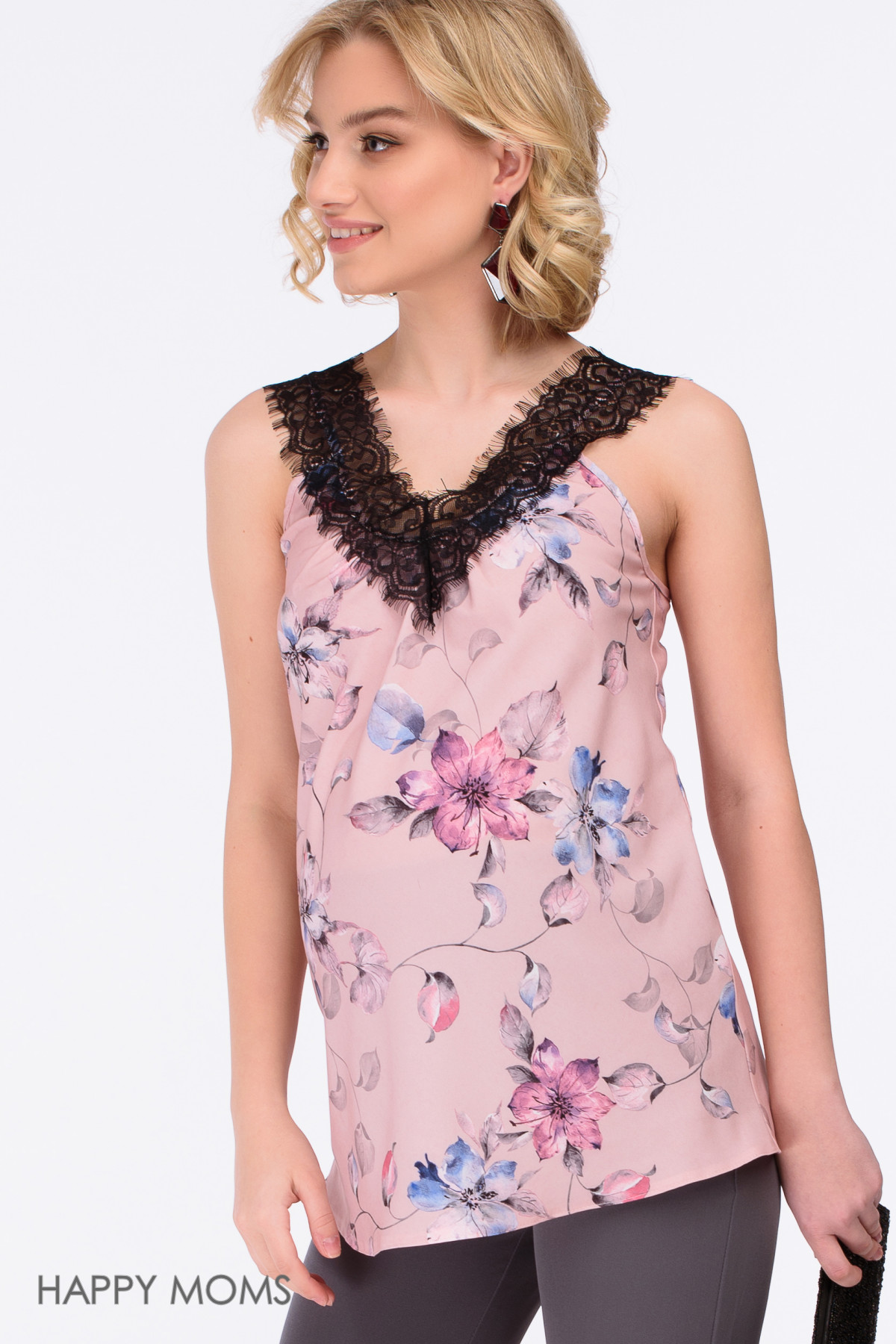 Топ для беременных с шикарным цветочным принтом и роскошным контрастным кружевом. Оригинальный крой изящно драпирует ткань по фигуре, создавая дополнительный объем на животик. Длина топа до середины бедра, плечи и верхняя часть спины открыты. Черное кружево красиво оттеняет кожу, из V-образного выреза переходит в широкие лямки на спине. Ткань легкая, воздушная, отличный вариант для жаркого лета. Топ прекрасно сочетается с брюками и юбками, при наличии определенных аксессуаров может стать деталью вечернего ансамбля. Универсальный фасон позволяет надевать модель и после рождения малыша: «летящая» ткань и свободный силуэт сделают образ легким и утонченным. Мягкая и приятная на ощупь ткань. Проста в уходе.