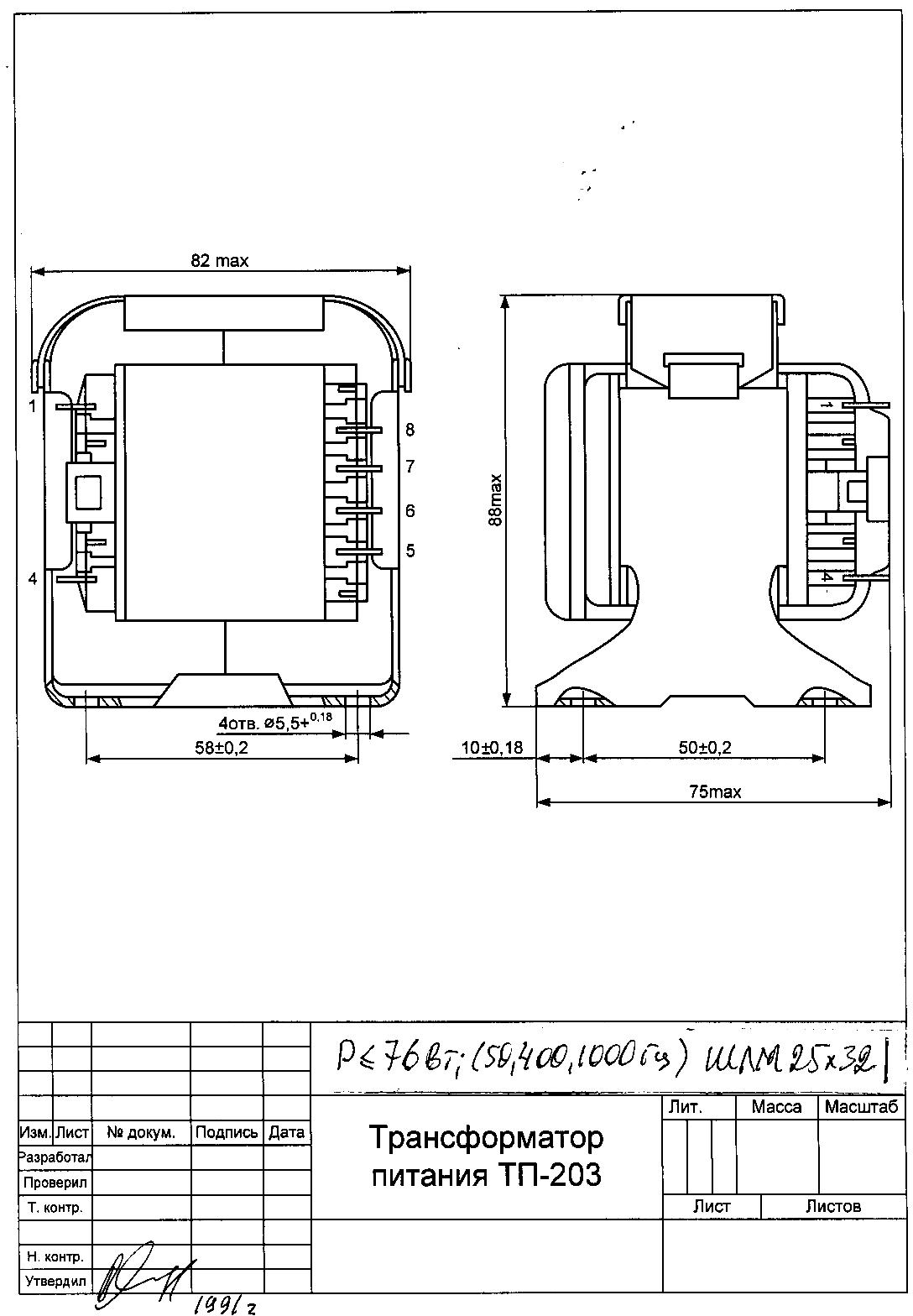 Трансформатор питания ТП-203-(76 Вт) ГОСТ 14233-84(50,400,1000 Гц)