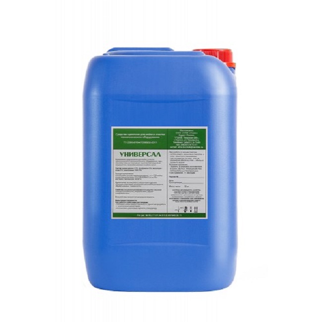 Универсал низкопенный - Щелочное низкопенное хлорсодержащее моющее и обезжиривающее средство для комплексной мойки пищевого оборудования, тары, промывки форсунок инъектора, мойки доильного оборудования.