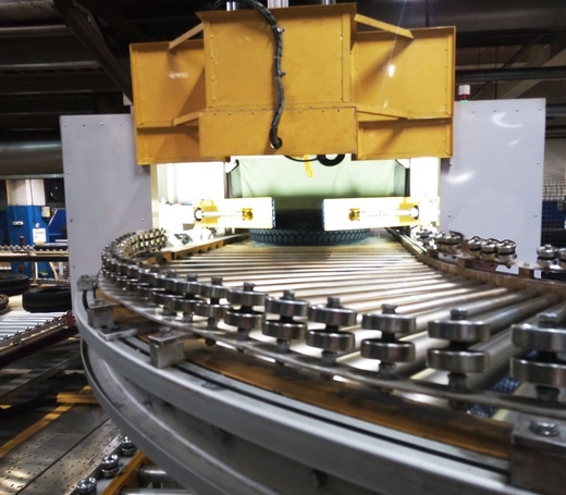 Исходя из рисунка и габаритов протектора, устройство направляет покрышку на нужный транспортер.С помощью двух створок ворот, покрышка останавливается и центрируется для определения типа протектора камерой технического зрения.