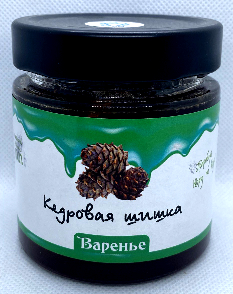 Варенье из молодой кедровой шишки, в кедровом сиропе, от компании Регион-К "Дары Югры". Место сбора дикоросов Ханты-Мансийский автономный округ - Югра. Состав: шишка кедра сибирского, сахар, вода.