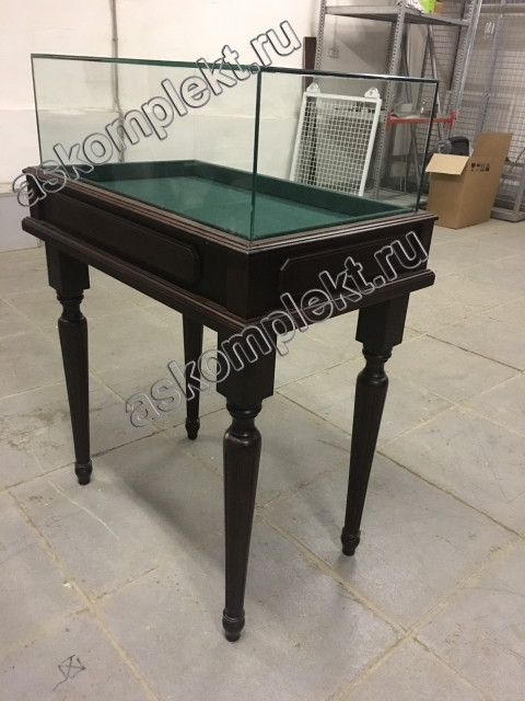 Массив дуба. Подложка-ткань. Наклонная или прямая поверхность основания. Изготовление колпака витрины возможно различной формы и размера.