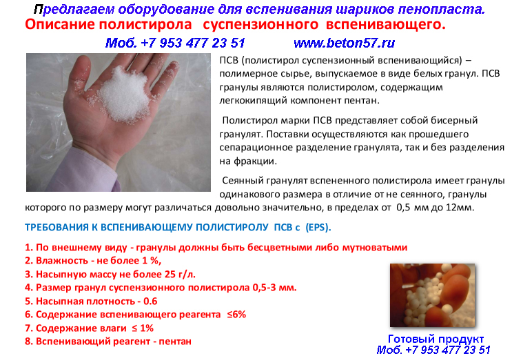 Сырьем для производства пенополистирола является Полистирол суспензионный вспенивающийся самозатухающий типа ПСВ-с (ТУ 6 06 1905 61), ПСВ А (ОСТ 6 05 202 83), размер гранул 0,4 — 3,2мм.