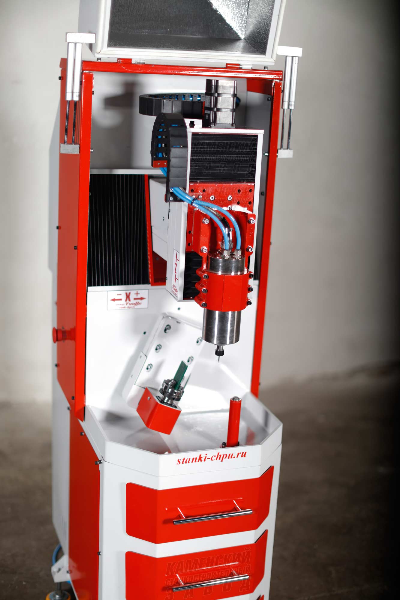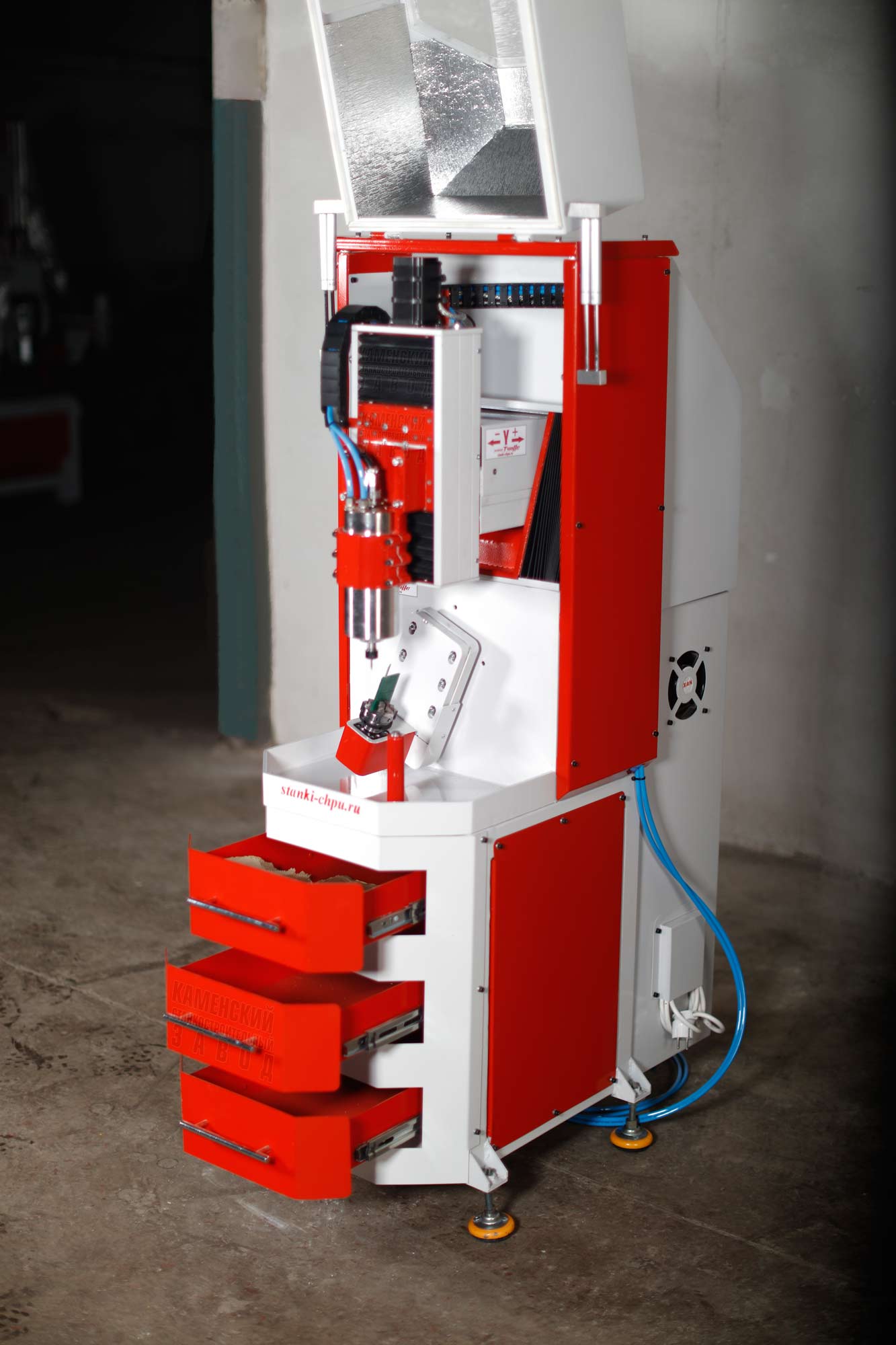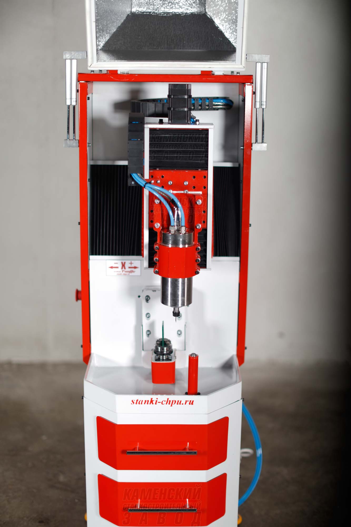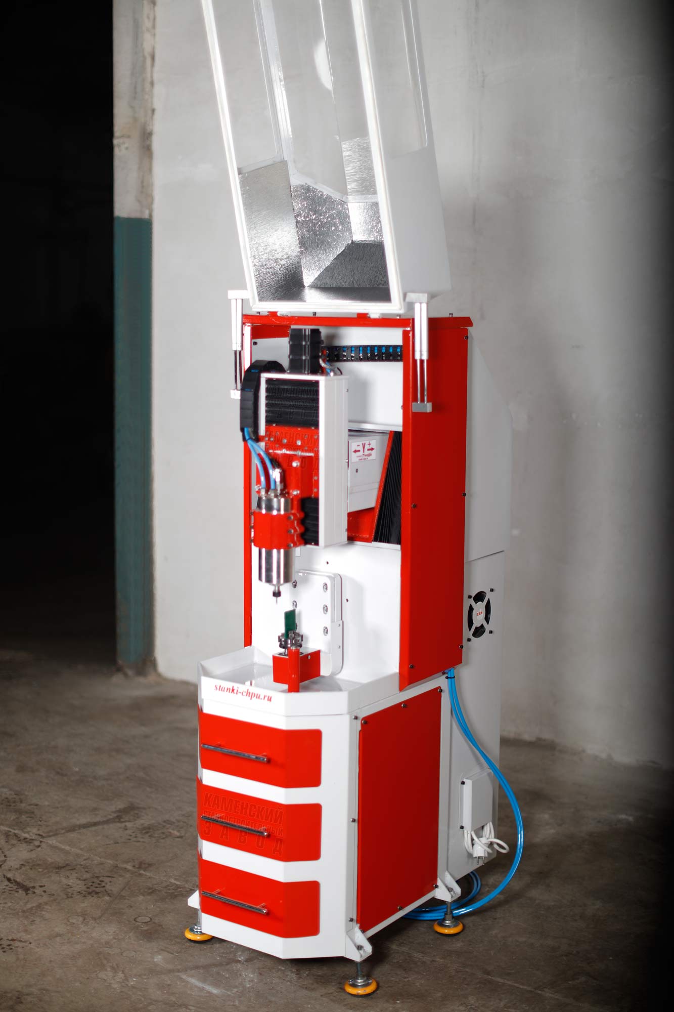 Станок оснащен специальным защитным кожухом, что сильно снижает шумность станка, а также защищает помещение от появления стружки, образующейся при работе станка. Благодаря этому станок можно устанавливать даже в жилых помещениях.