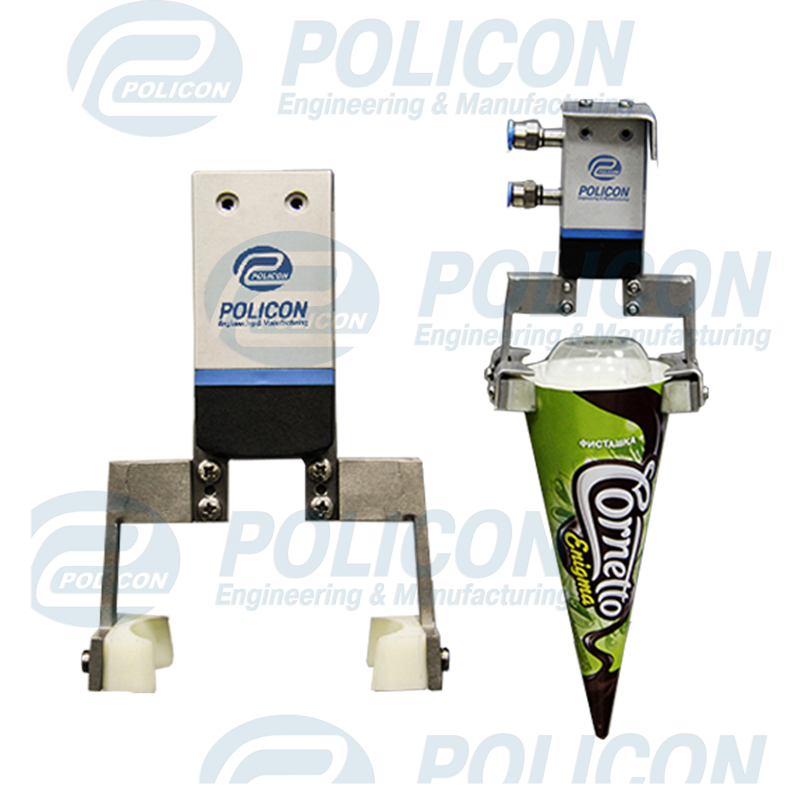 Пневматический захват мороженого типа “Конус” устанавливается в линиях переноса мороженого и предназначен для захвата, удержания и отпускания мороженого в нужном месте.