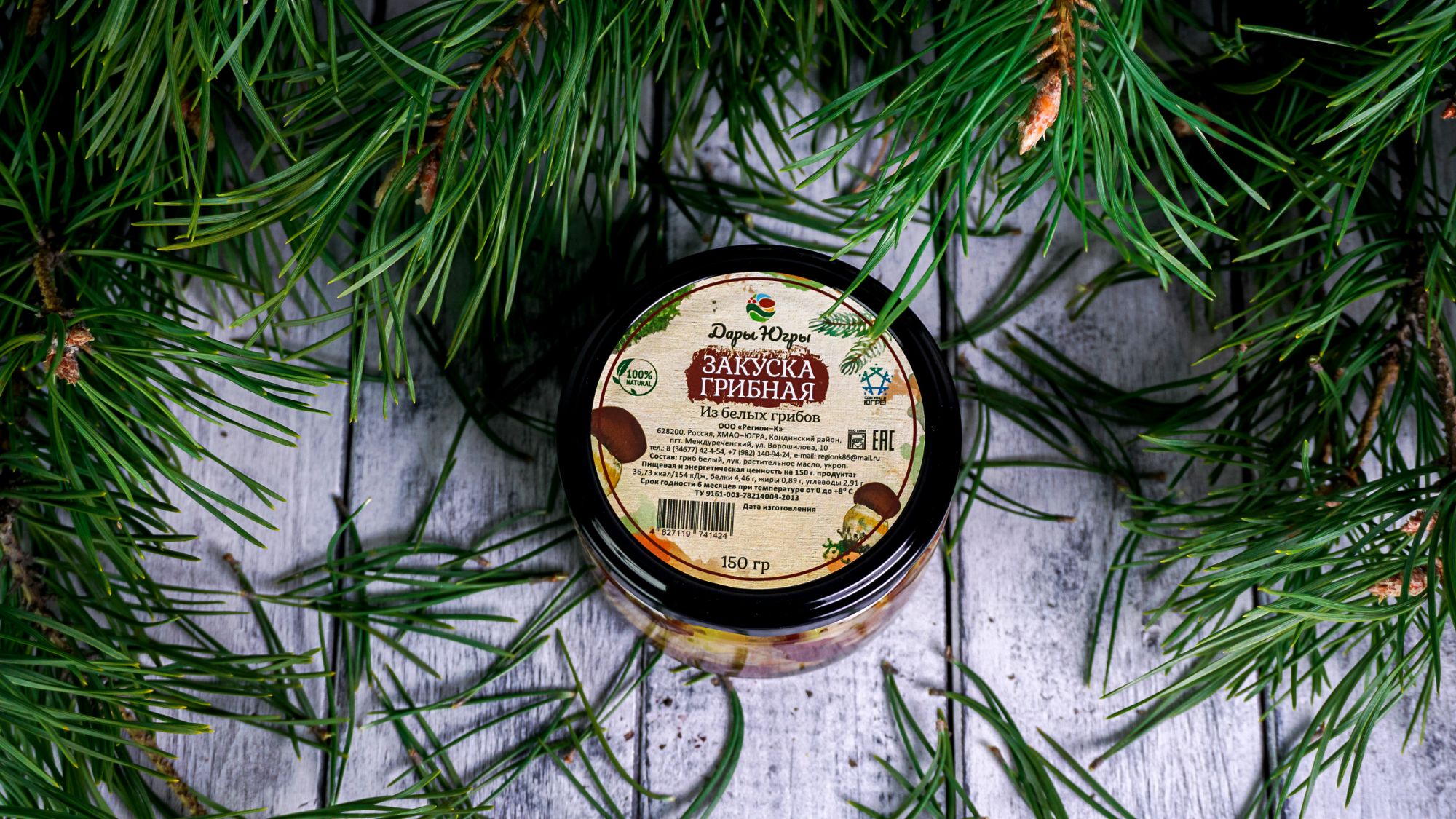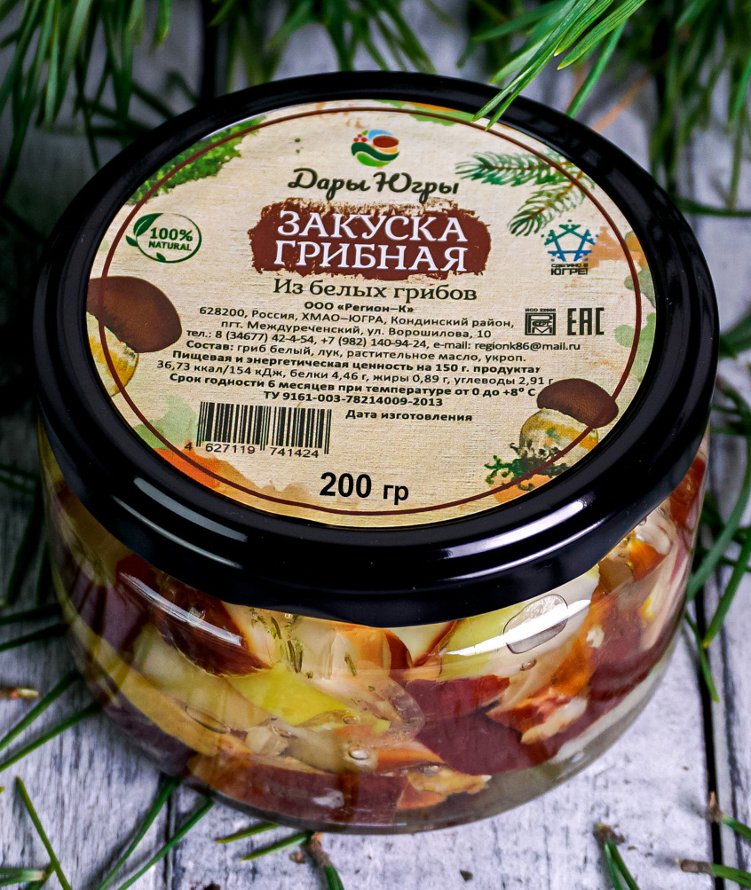 Закуска грибная из белых грибов боровиков от компании "Дары Югры". Место сбора дикоросов Ханты-Мансийский автономный округ - Югра. Состав: гриб белый (боровой), масло растительное, лук, укроп, специи.