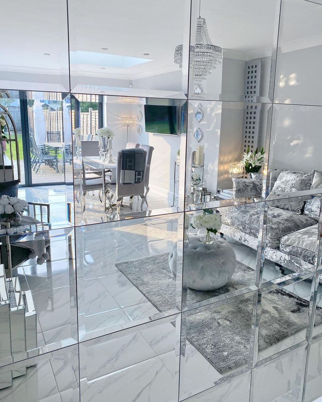 Как панно, так и зеркальная плитка с фацетом, вы их можете купить под заказ по индивидуальным размерам, обеспечивают великолепный художественный эффект благодаря отражению других элементов интерьера, расширяют пространство и позволяют использовать фацет и другие различные обработки. При этом любой элемент мозаики можно заменить при необходимости. Быстрый монтаж зеркал – без подготовки, выравнивания стен, затирки, шлифовки, застывания и пр. составляющих внутренней отделки.