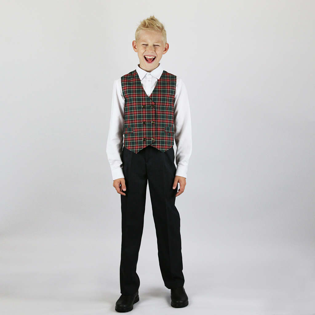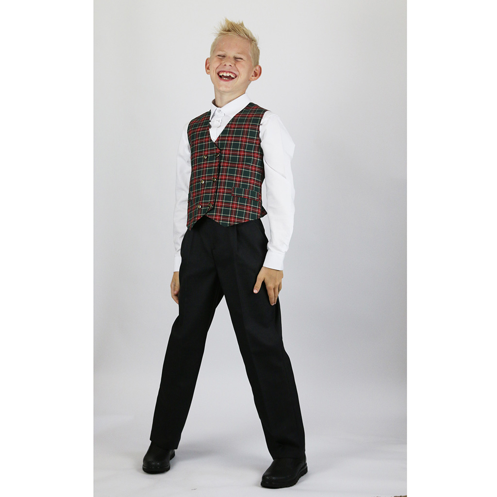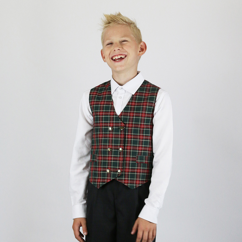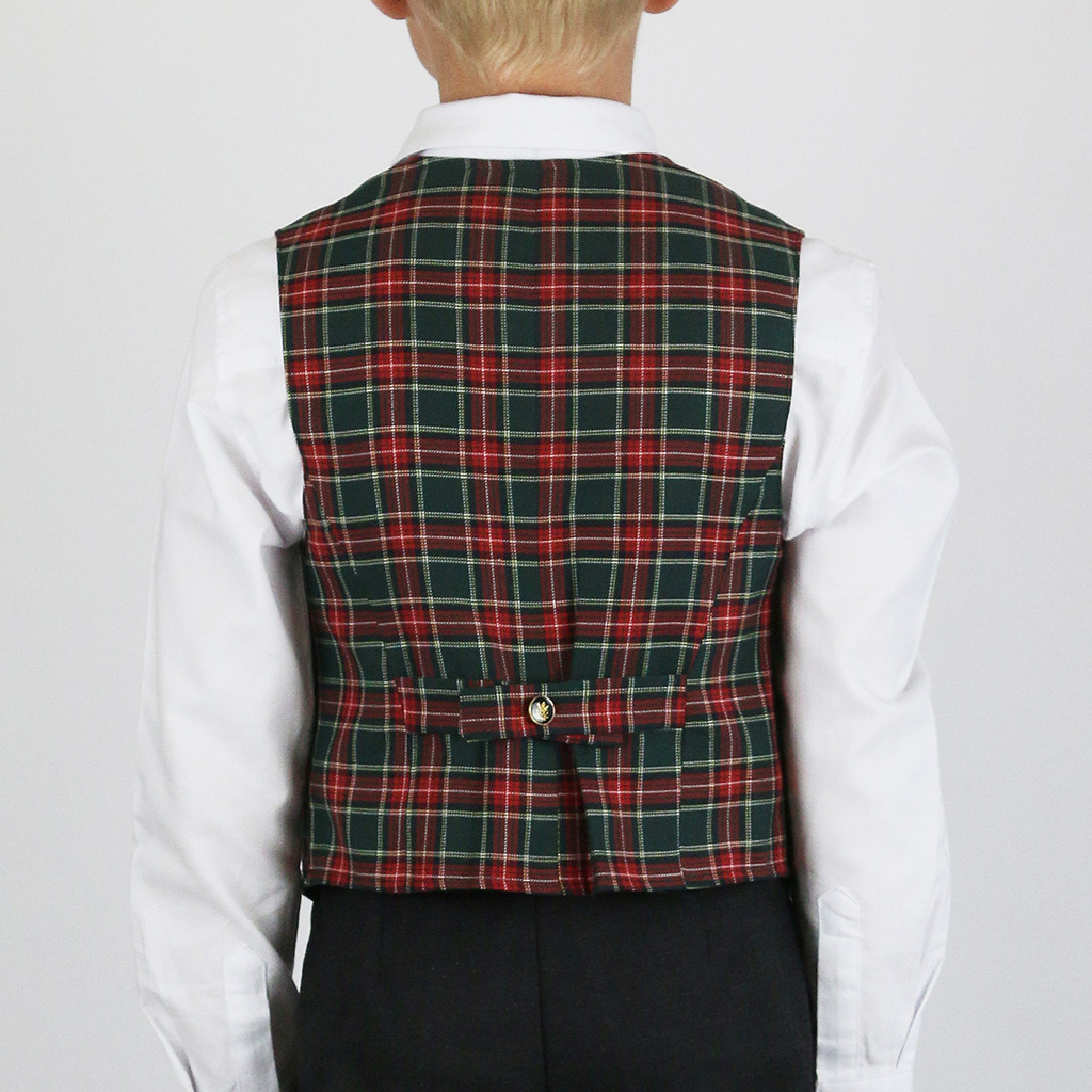 Жилет двубортный в красно-зеленую клетку для мальчика или девочки. С листочкой. Производство — Россия, Москва.