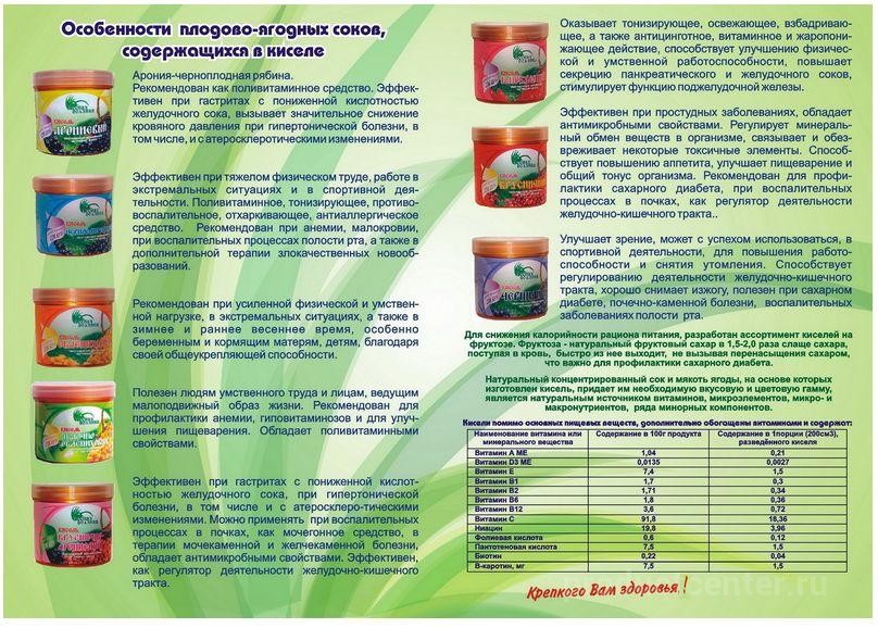 Компания занимается переработкой плодово-ягодной продукции и производством натуральных, обогащённых витаминами киселей, пищевых концентратов.